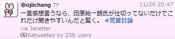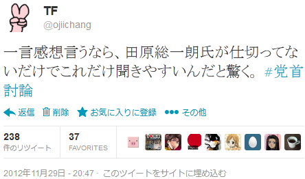 ニコ生で党首討論があったので、なにげなく素直な感想を呟いてみた